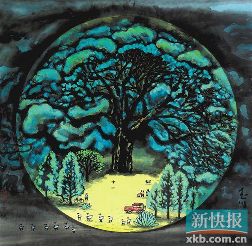 草坪、空无一人、柴门犬吠,企图突破云层直至有形圆圈顶部乃至无形禁锢的郁郁葱葱大树,这些景象色彩明亮,笔端有种遥望童年的拙稚,它也许成像于异国他乡的孤独夜晚,记录的却是人声相闻的故土情怀,它是母亲呼唤呵斥的啰嗦叮咛,是少年暗夜涉河的忐忑期待,有挣扎出离泥沼后回望的轻松和怜悯,也成为登顶拔刀四顾孤然的自我安慰。