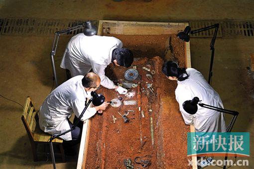 如果说,开棺是一场化学试验,那么发掘则如外科手术。在若干白炽灯照射下,李存信手中的竹片、竹签交替上阵,挖、抹、剔、擦,令人眼花缭乱。