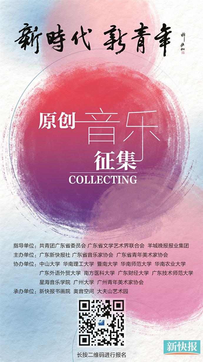 为庆祝中国共产主义青年团成立100周年,弘扬主旋律,传播社会正能量,彰显新时代、新征程下青年艺术家的精神风貌,由共青团广东省委员会、广东省文学艺术界联合会、羊城晚报报业集团指导,广东新快报社、广东省音乐家协会、广东省青年美术家协会共同主办,中山大学、华南理工大学、暨南大学等广东多所知名高校共同协办的“新时代·新青年”原创音乐美术展演活动,于4月30日正式启动原创音乐征集。