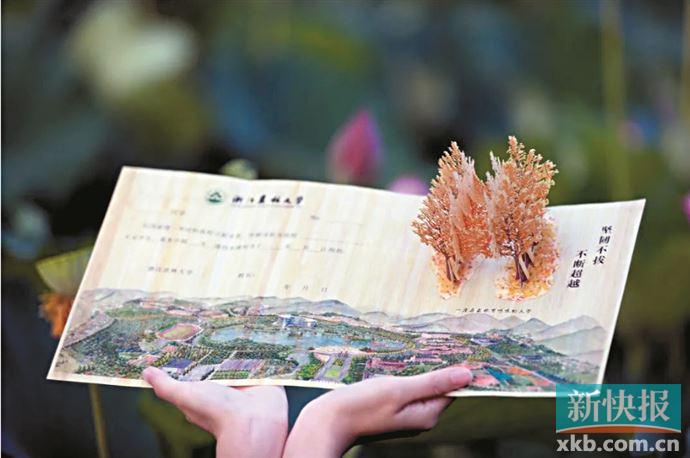 浙江农林大学今年的录取通知书以刨切微薄竹为原料制作,技术和设计上进一步升级,材质更薄更坚挺,厚度降低到0.28~0.3毫米,不到3张普通A4纸的厚度,可任意对折、侧压、卷曲,可像纸张一样卷曲成轴。