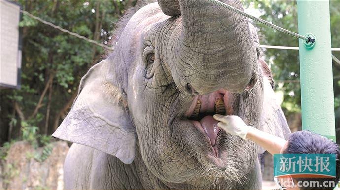大熊猫和大象则用食物来促进口腔健康。保育员拿了一根香蕉来到大象跟前,在投喂的时候,大象张大了嘴巴,这正是检查牙齿的好时机!“大象的牙齿在嘴巴左右上下四个位置,可以看出它牙齿还不错。”保育员告诉记者,动物园一般会通过调整大象的食物帮助它的牙齿保持更久,比如多喂食一些树叶。