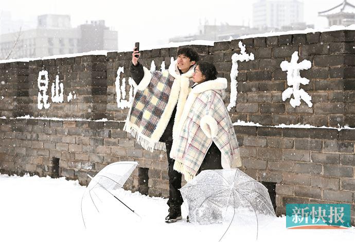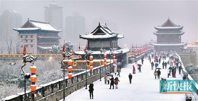 ■1月16日,游客在西安城墙玩雪。 新华社发