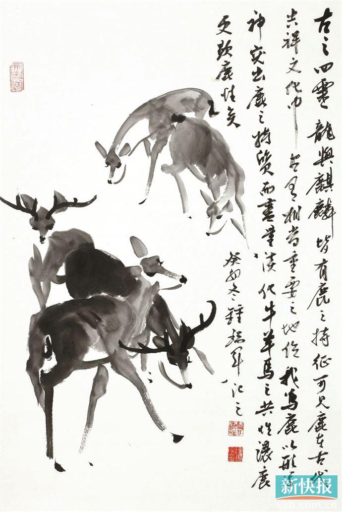 由广东省南方画院主办,“丹鹿同春——周国城、钟瑞军中国画作品展”近日在广东省南方画院美术馆举办,展出两位画家国画作品近60件。作为“天平楼”的一员,钟瑞军受教于周国城已有十数年,“天平楼”推崇的诗、书、画、印综合修养培养了不少当今岭南画坛的中坚力量。广州市美协名誉主席的周国城表示,“中国画关键在书法,所以,我的画尽量都像书法一样写出来。”广东省青年美协主席的钟瑞军则说,“我画的不仅仅是鹿,更是对中国文化的理解。”