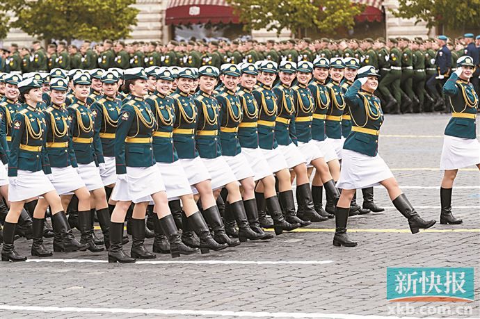 5月9日,在俄罗斯首都莫斯科,女兵列队走过红场。