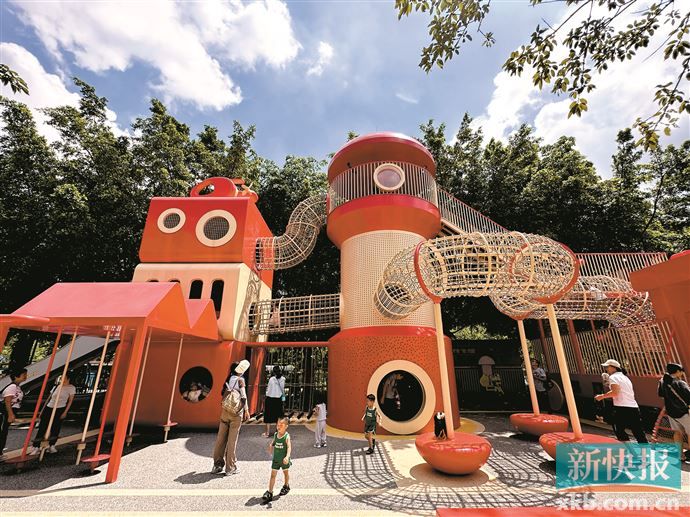 除了戏水乐园,广州市儿童公园还上新了两个结合攀爬的综合性项目,同样很受欢迎。“长”得很像消防车的消防乐园里,孩童们在滑筒、瞭望塔间穿梭,“扮演”消防员,使用不同模样的消防水枪,体验消防救援的不易。