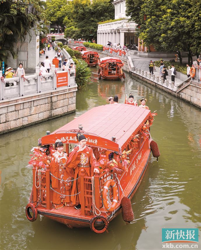 当天上午,来自不同行业和地区的新人们在亲朋好友的陪伴下,身着传统中式婚服,齐聚荔湾湖公园。新人们乘坐着车队,沿着华贵路、长寿路、多宝路等承载着美好寓意的幸福之路“爱”游西关。随后,搭乘游船“囍”游荔枝湾涌,携手踏上新的幸福旅程。