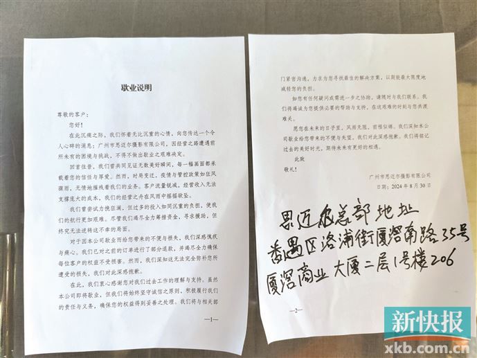 随后,记者来到位于天河区富星商贸大厦的珠江新城店,只见大门紧闭,玻璃门上贴出了一份既没有公章,也没有联系方式,落款时间为2024年8月30日的歇业说明。思迈尔儿童摄影在歇业说明中写到,因经营之路遭遇前所未有的困境与挑战,不得不做出歇业之艰难决定。该大厦物业方面表示,该门店在8月底悄然撤离,租赁合同还未到期,仍欠门店业主两三个月的房租,且无法联系到负责人。近日陆续有家长上门询问,物业方面正在就未使用的消费金额等情况进行登记,后续将提交给公安部门。
