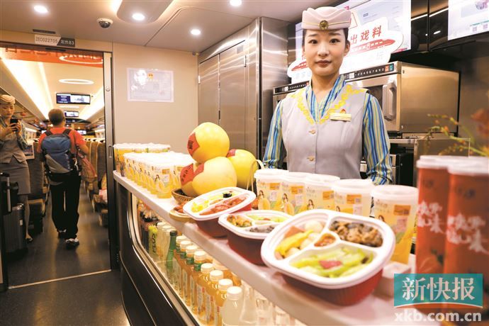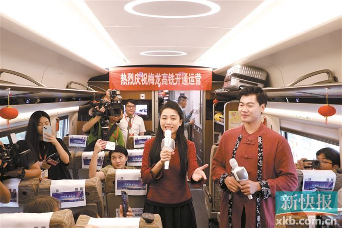 梅龙高铁首发列车。餐车根据梅龙高铁沿途地区美食,在餐车上配有客家梅菜扣肉、荔枝肉、三鲜鱼丸等特色风味的套餐,给旅客带来丰富的客家口味体验。梅州被誉为“中国金柚之乡”,为此高铁上专门为梅龙高铁推出蜂蜜柚子茶。坐上高铁去梅州旅游的赵先生和朋友表示,一早就听过梅州客家美食的名声了,没想到在高铁上也能先品尝一杯甜美的柚子茶。