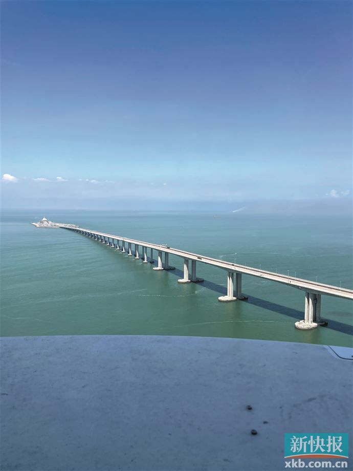 11:21,直升机的窗户外出现了港珠澳大桥美丽的身影,犹如一条长长的白龙,飘在碧波浩渺中,十分壮观。直升机在港珠澳大桥飞行了五分钟左右的时间。