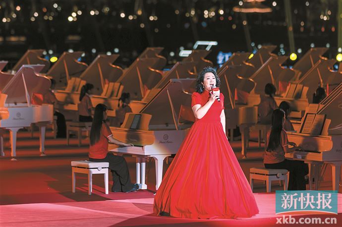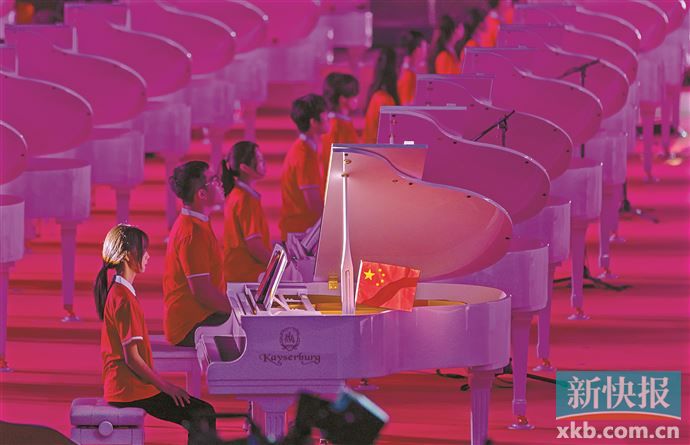 随着《红旗颂》前奏响起,“湾区百琴颂中华”传唱会正式拉开帷幕,100位来自不同领域、不同行业的钢琴演奏者同台齐奏100台三角钢琴,气势磅礴的演奏传递爱国情怀,礼赞新时代。