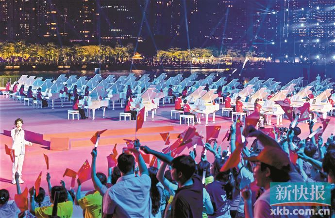 9月29日晚,广州塔下、珠江之畔,“湾区百琴颂中华”大型传唱会成功举办。100台三角钢琴在广州塔下呈现“75”字样,1000多名群众现场奏唱国歌,以传唱爱国歌曲的形式热烈庆祝中华人民共和国成立75周年。