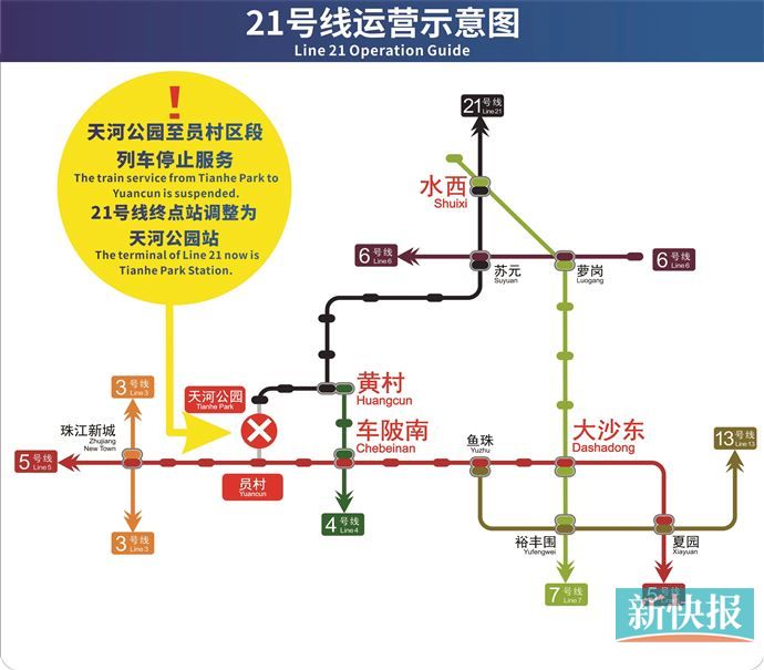 新快报讯 记者李佳文报道 广州地铁再次发布提醒,为实现广州轨道交通首条环线——11号线年底开通的目标,10月2日起21号线天河公园至员村区段将进行拆解施工,当天运营时间起天河公园至员村区段的列车将正式停止服务,21号线终点站将由员村站调整为天河公园站。拆解改造工作预计需要88天。