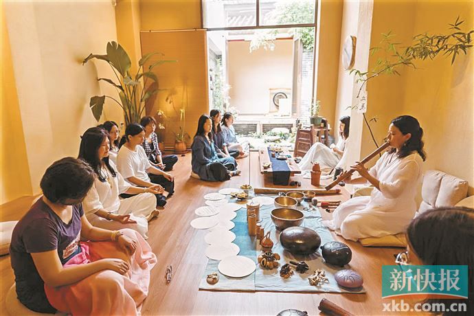 在从事了十七年的金融工作后,米里通过学习心理学与自然音乐,成为一家音乐疗愈机构的主理人。每个周末,在荔湾区泮塘五约的“听草堂”,这里开展“躺着听的音乐会”,以及自然音乐疗愈工作坊。米里使用包括颂钵、雨棍、海浪鼓、尺八、灵罄、马铃、牛铃等乐器,为参与者进行声音疗愈。