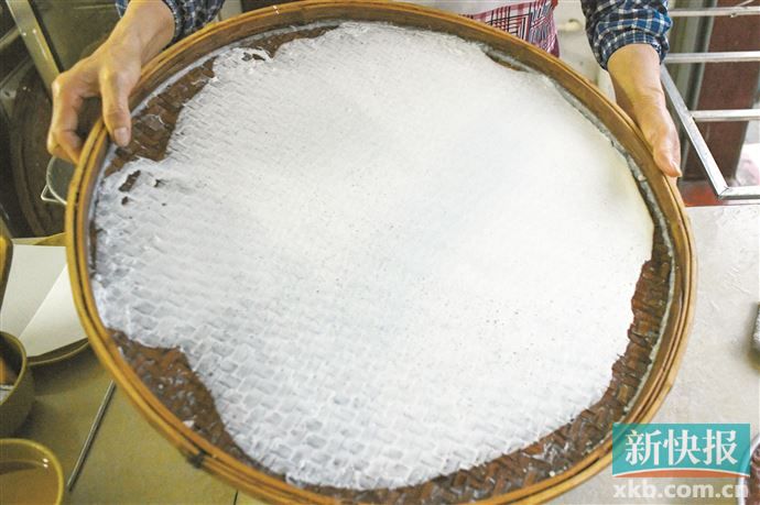 据说肠粉最古老的制作方式之一,就是使用窝篮;所谓“窝篮”,北方人可能会称之为“簸箕”“筲箕”等,是一种竹篾编织成的圆形器皿,将事先准备好的米浆均匀地铺倒在窝篮上,与制作沙河粉类似,这样蒸出来的肠粉薄而滑,十分有特色。