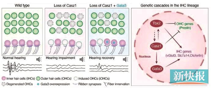 经过多年探索和坚持,团队首次验证了Casz1在听觉毛细胞中的双重作用:不仅能保障内毛细胞的命运和功能稳定,还参与维持外毛细胞的存活。