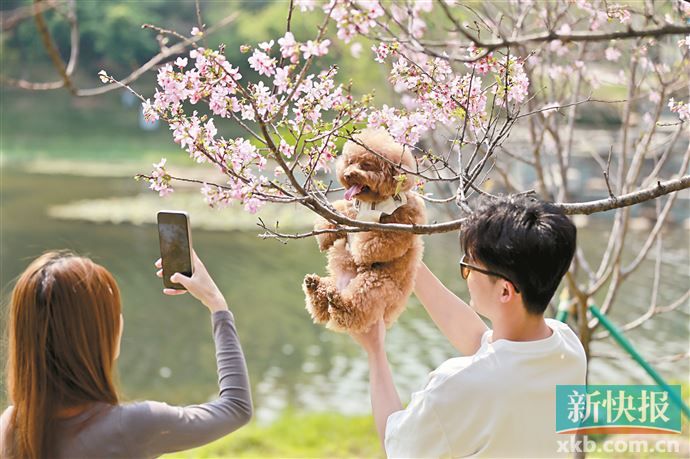 到创业公园看花的人多半是附近居民,除了看花、拍照,还有人牵上宠物狗来赏花,顺便让“毛孩子”和樱花也合个影。