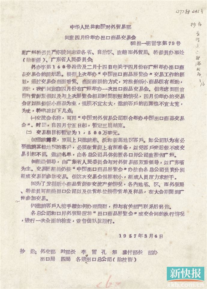 刘雅琦展示了一份档案。这是1957年3月4日发出的,中华人民共和国对外贸易部同意四月份举办出口商品交易会的一份文件,这一件档案的珍贵性,在于它是广交会的“出生纸”。