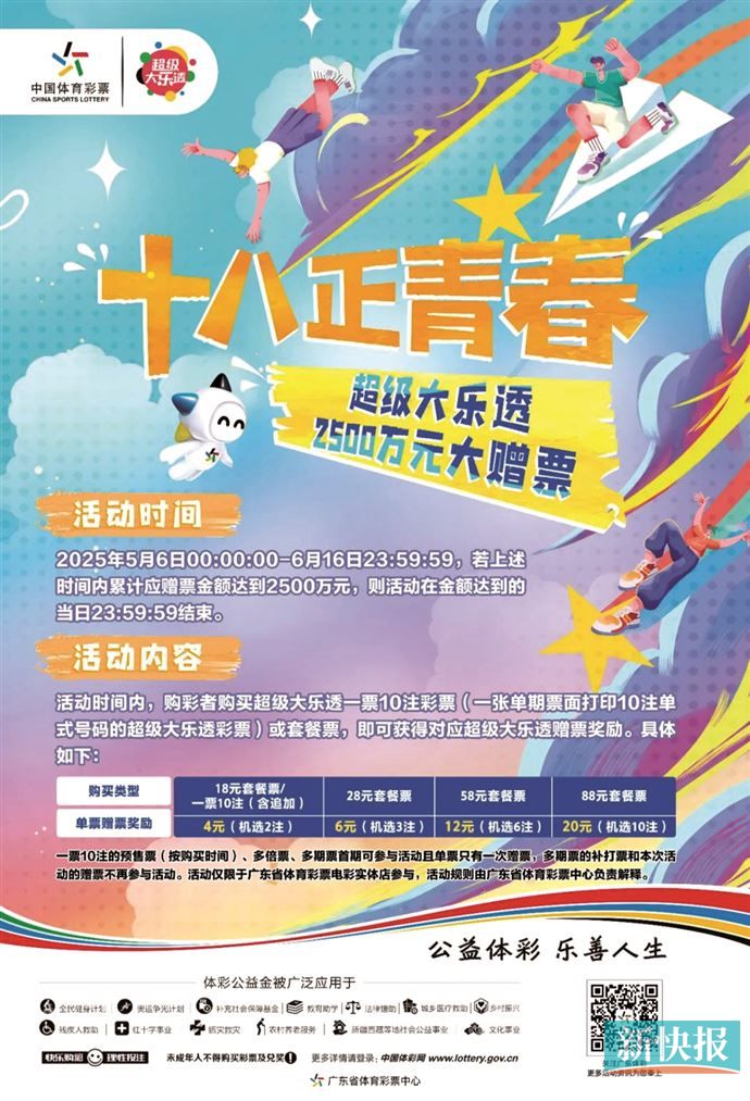 新快报讯 记者陆妍思报道 为感谢广大购彩者对超级大乐透的支持,广东体彩将于今日起开展“十八正青春 超级大乐透2500万元大赠票”活动。