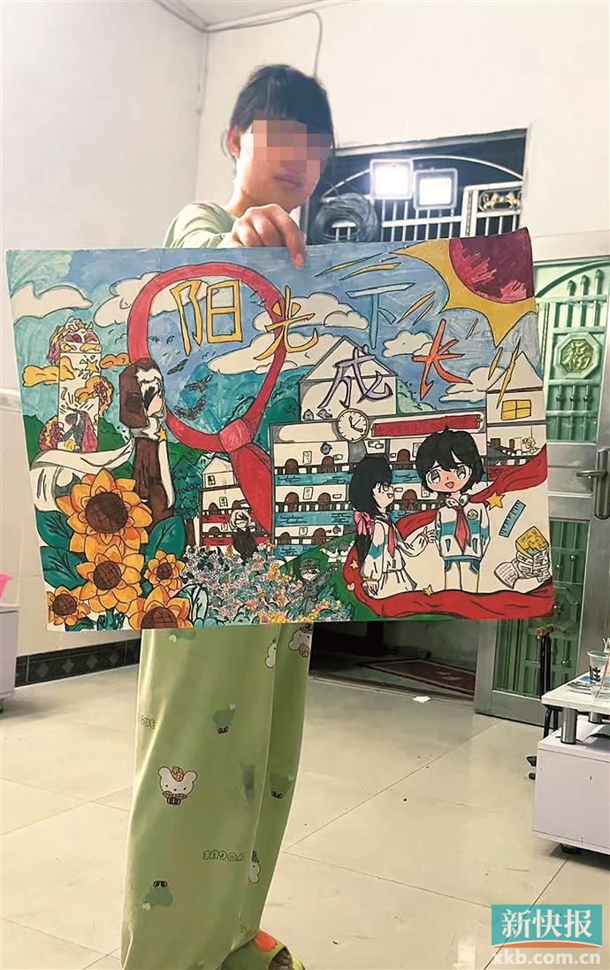 晴晴妈的手机相册里存了不少晴晴画,“她的愿望都画到里边,我们看得到。”晴晴妈翻开一张母女俩都很喜欢的画作,五彩的颜料清晰勾勒着女孩斑斓的世界:琅琅书声的课室,戴着红领巾的女生,周边繁华绿叶,向日葵抬头看向蓝天白云……晴晴给这幅画题了名——“阳光下成长”。