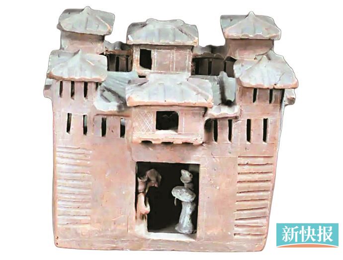 广州博物馆藏有一件陶屋,门口有门神图案。这被认为是早期门神出现的物证。而建筑明器中最为复杂的是坞堡类明器,研究这类明器,可对当时的社会等级制度、日常生活和礼节仪式方面有一定程度的了解。拥有城堡的大地主东汉时期,一些贵族阶层大力开发农业种植,积聚大量财富,逐渐形成拥有大庄园、私人部曲的豪强大地主,他们多居住在番禺城东北郊、南郊一带。他们的墓葬多采用砖石结构,随葬陶城堡、陶水田、陶牛马等明器,应是他们生前富裕生活的反映。
