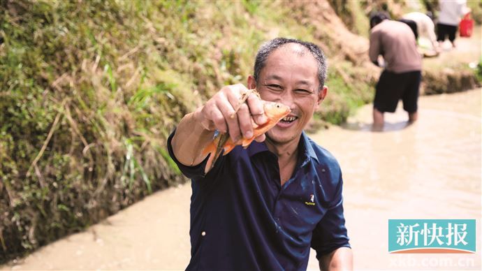 当天,来自太保镇莲塘村的非遗狮舞用欢腾的舞步迎接着客人,游客们与“狮子”近距离互动打卡;与村民一同下田弯腰割稻、打谷脱粒,体验收割水稻的艰辛与快乐;在灌满山泉水的梯田里挥镰捉鱼,与肥美的梯田鱼展开“追逐战”,在欢声笑语中体验农耕乐趣与丰收喜悦,构成了一幅产业兴、乡村美、农民乐的动人画卷。