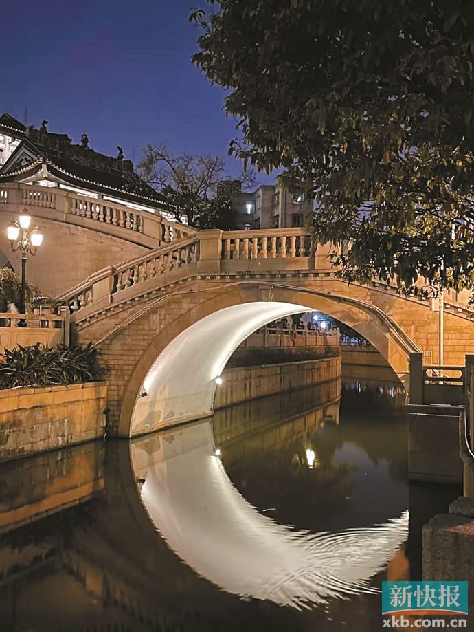 如果说,白天的永庆坊非遗雅韵与市井声响交织,那么当夜幕降临,华灯初上,才是它最显风情的时刻。此时,不容错过的当属永庆坊的网红“月亮桥”。当暖色的灯光亮起,半圆的拱桥与水中倒影完美衔接,在水面勾勒出一轮“圆满”的明月,虚实相生,意境悠远。恰逢国庆、中秋双节将至,不必刻意追寻天上的月亮,来永庆坊潺潺流水边“赏月”,也别有一番风味。
