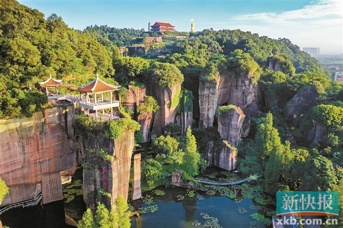 攀登莲花山,可见众多奇岩异洞和悬崖绝壁。广州莲花山是古采石场遗址、中国两大古矿场之一。开采过的岩石地貌,岩洞潭壑,千姿百态,恍若鬼斧神工的自然杰作,被称为“人工丹霞”,也是南粤先民开山劈石、建设城乡的见证。