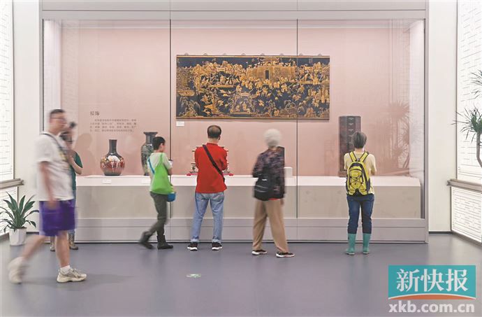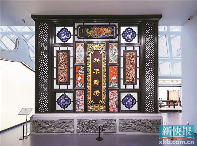 “物华锦绣”展厅所展是关于广东的生产生活美学,例如:色彩鲜艳、精细繁复的织绣,釉色润泽、造型典雅的陶瓷烧制,刻工巧夺、精致华丽的广东木作,以及常用于节庆装饰的木版年画与剪纸等。这里还把广东人的屋檐“搬”进展馆,方便人们近距离欣赏屋顶嵌瓷的惟妙惟肖。