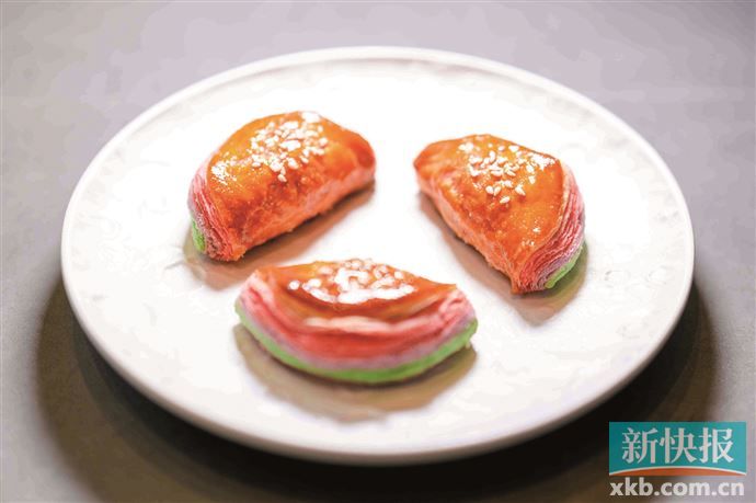 另一款酥类点心黑椒牛肉酥同样复刻自历史上羊城知名的星期美点,传统起酥工艺搭配三层色彩,好吃又好看。