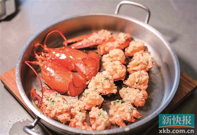 啫煲当然是主打之一,但与传统粤菜相比,新鲜花椒、黄贡椒等元素的融入,也让味蕾增添了更多不一样的体验。一款蒜茸啫蓝龙虾,蒜茸绝对堪称点睛之笔,每一块被斩开的带壳蓝龙虾肉上都堆着满布的蒜茸,蒜香扑鼻,最难下手的虾钳部分已被去了大部分硬壳,只保留了一小块可以手持的虾壳,直接拿起来大快朵颐,好不快哉!