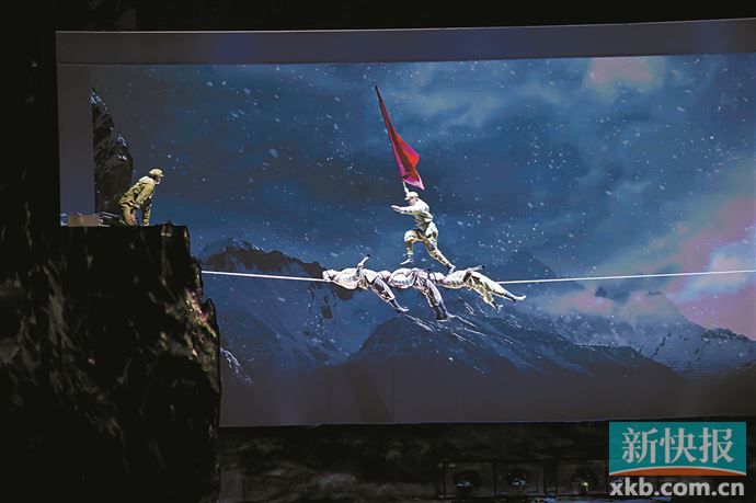 新快报记者在现场看到,在大雪纷飞的布景,悲壮低沉的背景音乐中,演员们“艰难”地在悬挂的长绳间飞跃,伴随着动画背景里的雪崩和落石,再现了当年修路环境的恶劣。在一段空中飞人的演出结束后,舞台上矗立的两座山之间,巧妙地架设出了一条钢丝,国家级非遗达瓦孜绝活正式亮相。