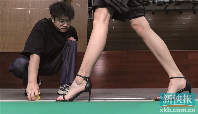 ■在训练中,教练会用尺子对引导员的步幅进行准确定位,脚尖张开的标准是15cm。