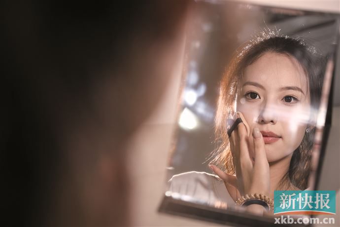 华南农业大学服装表演专业的刘佳颖同学训练前化妆。