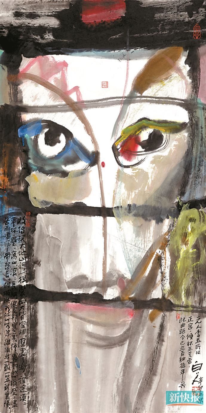 许固令:我的脸谱画也许说是实验水墨画更贴切吧。尽管我受西方艺术的影响很大,但中国传统文化的根,我却抓得很紧,也一直努力抓紧,但必须承认的是,不算深。此外,西方艺术的训练,虽然我们在广美附中也有系统的学习,但同样做得不够。因此,我的画也不是纯正的西洋画。概括起来,我想,用装饰画来形容我的脸谱画是最适合的,我就是一个装饰主义画家。相比画的文学深度或者油画技巧或者笔墨功底达到某个程度,我的画能够有装饰作用反而是更重要的,因为这样才能更好地走近大众,走近老百姓的家居生活。