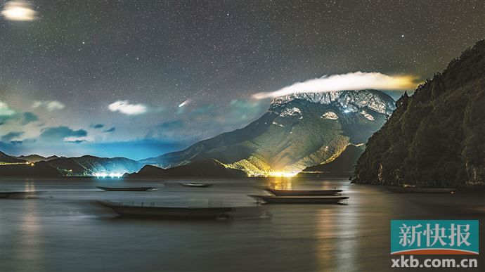 10月20日晚,天文爱好者王晋特意选择了空气通透、景色优美的云南泸沽湖作为拍摄地点。王晋告诉记者,泸沽湖如往常一般静谧而浪漫,这个看起来很平常的夜晚,被一位“天外来客”所打破。即将过近地点的莱蒙彗星,带着淡淡的尘埃尾和狭长的离子尾,在夜空中留下身影。“我通过长焦镜头,将莱蒙彗星的身姿与水面、格姆女神山、木船等元素融合在一起,展现出一种独特的视觉效果”。