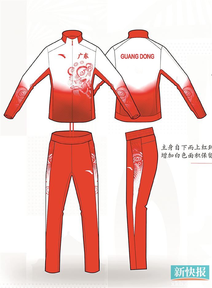 值得一提的是,本届全运会广东省代表团领奖服以红白渐变为图案基底,把广东省独特文化元素舞龙舞狮中的“醒狮”形象与全运会主视觉标识的烟花设计做结合,既有广东文化的审美特色,又寓意广东省代表团对本次全运会比赛全力以赴,再创佳绩。
