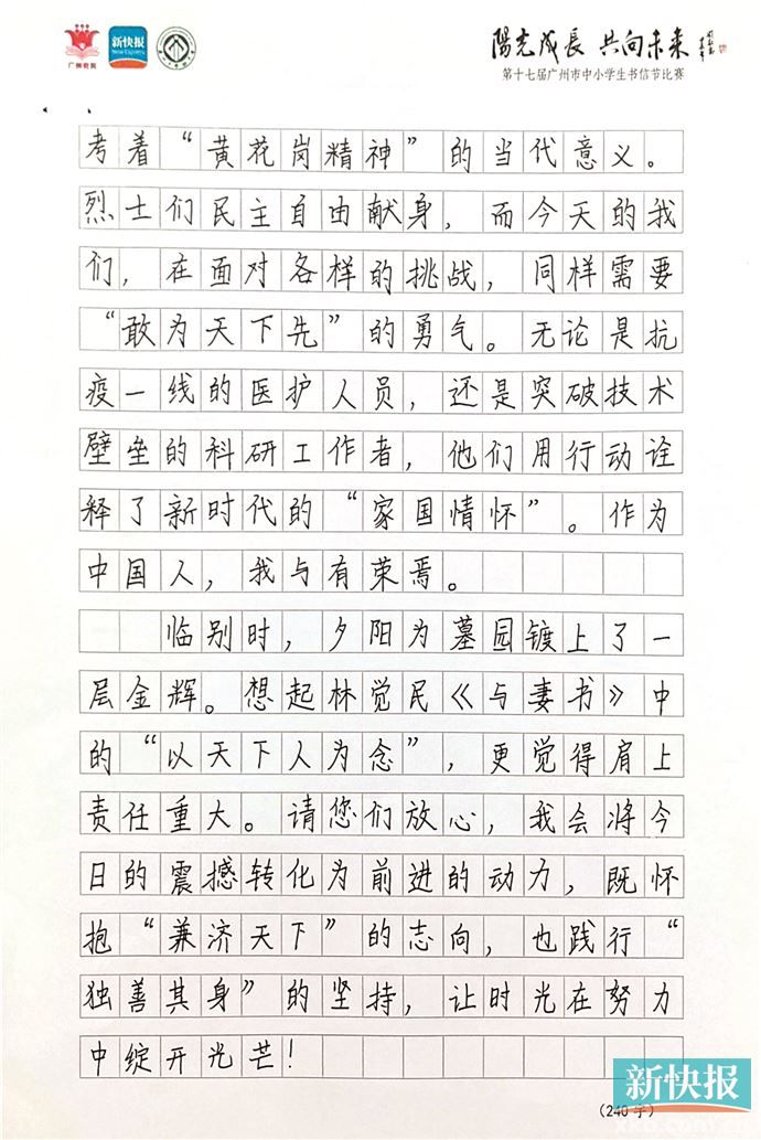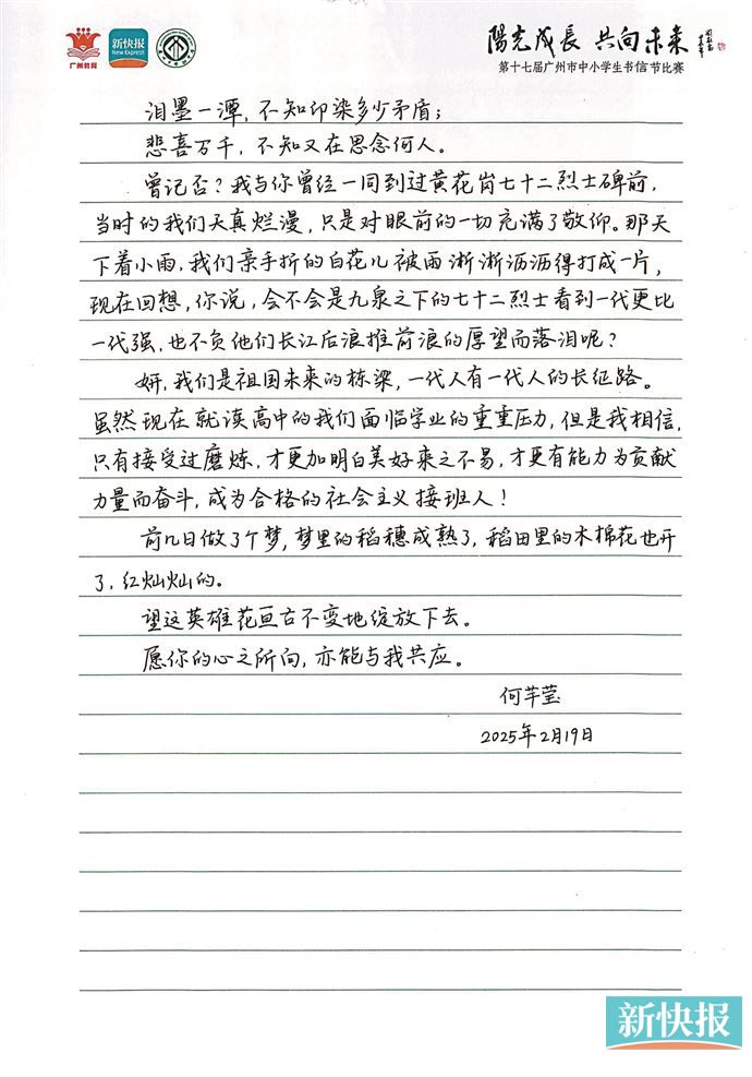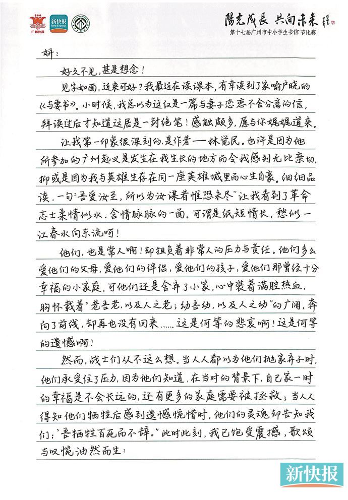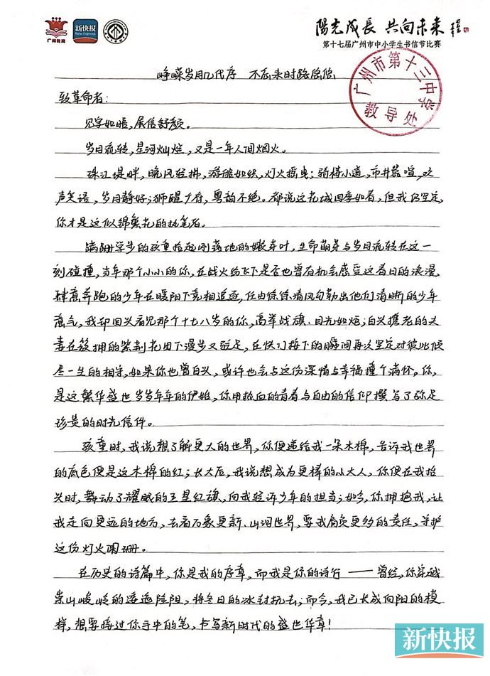 文字的力量,穿越时空,触动心灵。在本次由广州市教育局主办,共青团广州市教育局委员会、广东新快报社和广州市艺术中学联合承办的“阳光成长 共向未来”第十七届广州市中小学生书信节比赛获奖作品里,我们感受到了广州少年们炽热的情怀。在信中,他们或是向革命先辈表达敬仰,或是与历史英烈展开跨时空对话,将对家国的热爱、对先辈的缅怀、对未来的憧憬,都倾注于笔端,跃然于信纸之上。这些信件是少年们成长的印记,更是时代精神传承的见证。