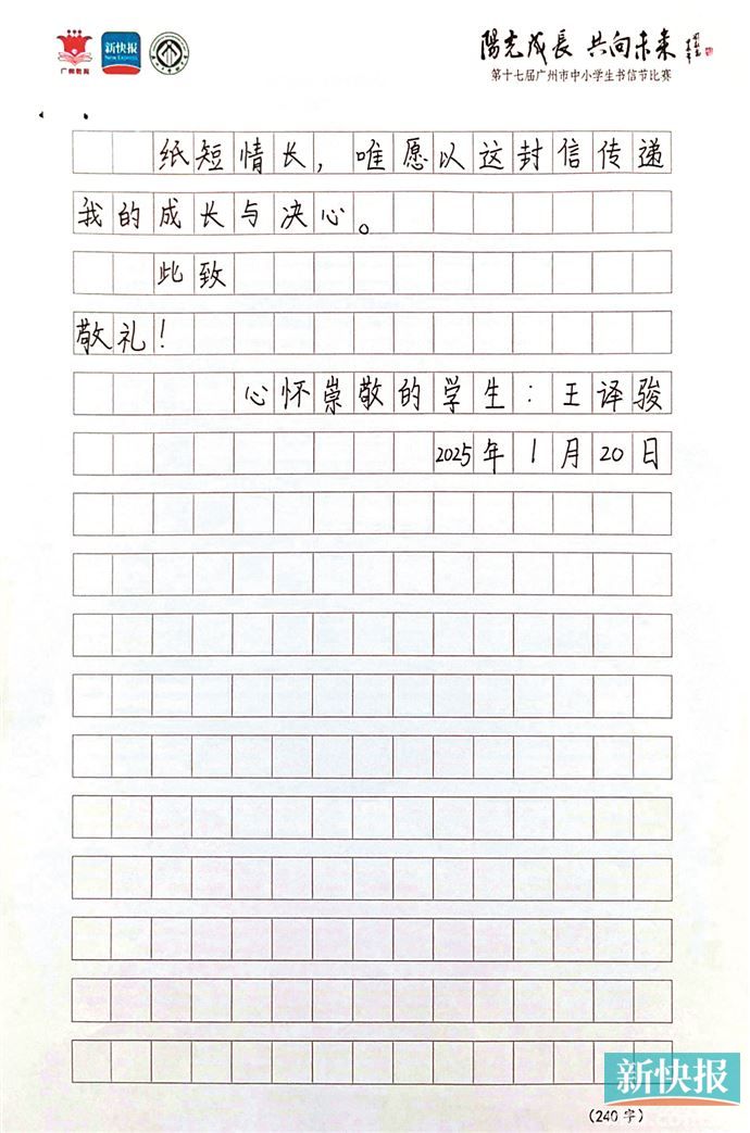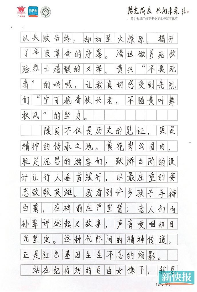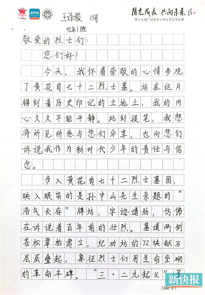 在本届广州市中小学生书信节比赛中,来自越秀区雅荷塘小学的王译骏凭借一封写给黄花岗七十二烈士的深情书信脱颖而出,荣获低年级组一等奖。“1911年4月27日的广州黄花岗起义是辛亥革命的关键节点,烈士的牺牲精神让我很感动,我有好多话想对他们说,我选择写信给他们。”译骏告诉新快报记者,自己此前在电视上看到了黄花岗七十二烈士的英雄事迹,内心充满对革命先烈的崇敬之情。今年1月,他和妈妈一同前往黄花岗七十二烈士墓园,现场的庄严肃穆深深触动了他,促使他提笔写下了这封跨越时空的书信。