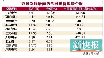 昨日,在大盘弱势下该板块指数涨近1%。主营智能电网设备制造业务和新能源产业运营的中能电气、中国特种电缆行业领军企业摩恩电气、布局输变电设备的新特电气等均受到资金追捧,股价涨幅居前。