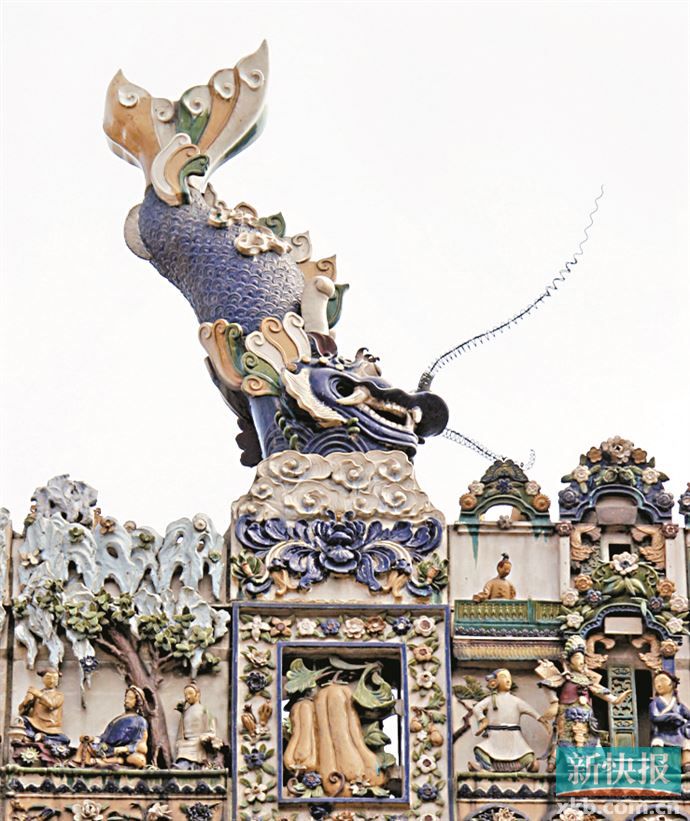 “岭南建筑艺术明珠”陈家祠瓦脊两端的鳌鱼陶塑共有9对,分别位于陈家祠9座厅堂的屋脊上。