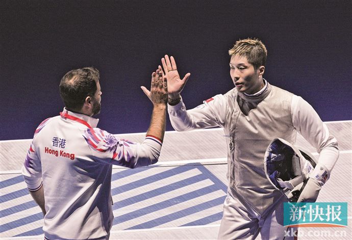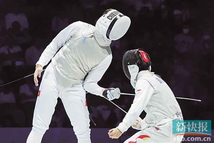 11月16日,在香港举行的第十五届全国运动会击剑男子花剑个人铜牌赛中,香港队选手张家朗(上图左)15比2战胜个人选手曾昭然,获得季军。