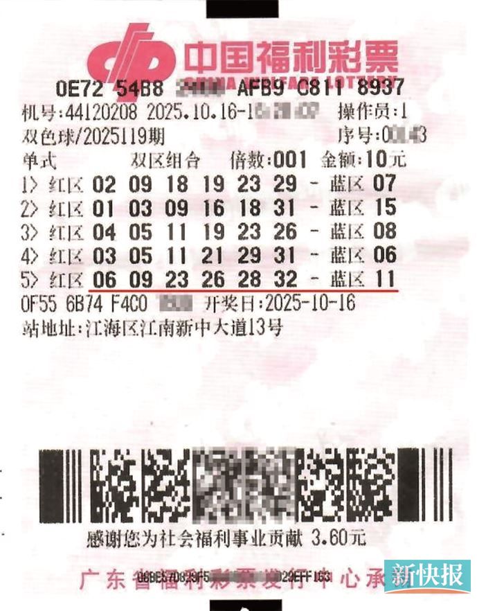 新快报讯 记者陆妍思 通讯员梁一鸣报道 双色球游戏第2025119期开奖中,全国共中出一等奖11注,其中1注花落广东江门市江海区江南新中大道13号铺的44120208福彩销售站点,中奖彩票是一张投注金额为10元的5注单式票,中奖奖金611多万元。