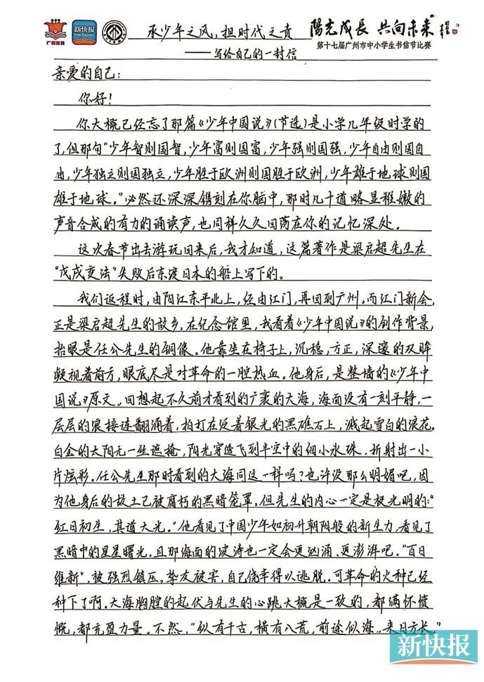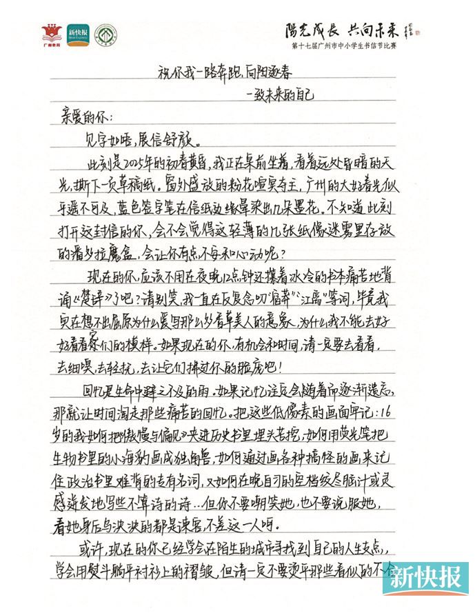 一封致自己的信,是一次自我对话,更是一份成长宣言。在由广州市教育局主办,共青团广州市教育局委员会、广东新快报社和广州市艺术中学联合承办的“阳光成长 共向未来”第十七届广州市中小学生书信节比赛中,广州学子在文字中与自己对话,在书写中明确初心,让少年意气在笔墨间代代相传。