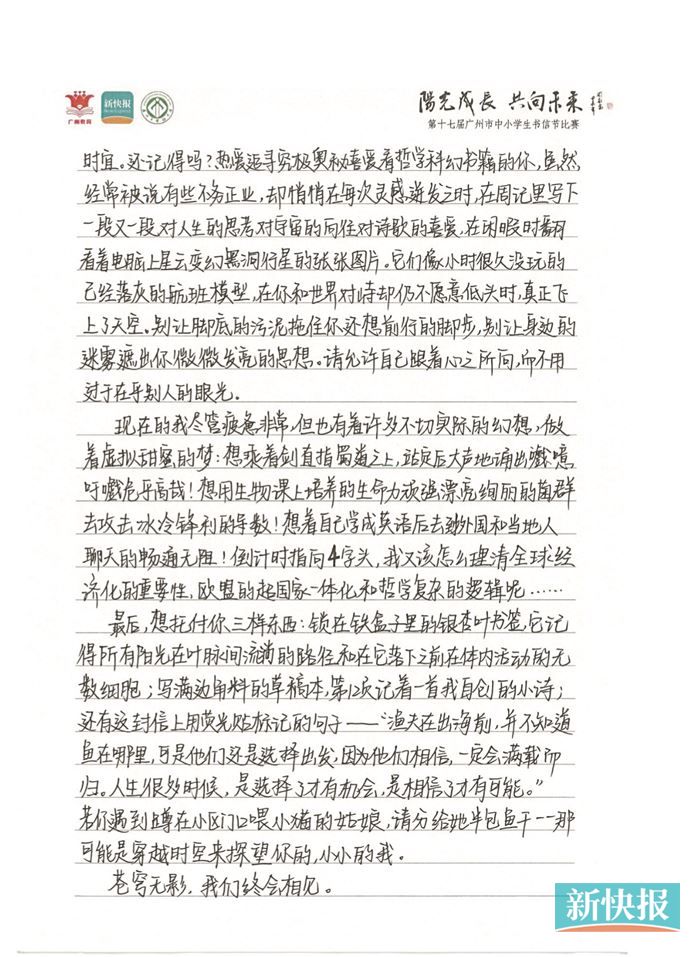 “别让脚底的污泥拖住你还想前行的脚步,别让身边的迷雾遮住你微微发亮的思想……”在这次书信节比赛中,广州市番禺区实验中学黄韵颖的《祝你我一路奔跑,向阳逐春——致未来的自己》获得了一等奖,她用优美的语句和天马行空的想象,写下高中生的心语和对未来的期盼。