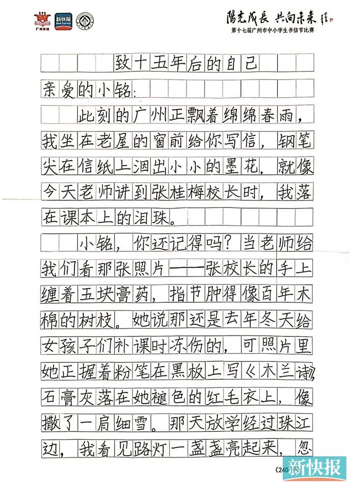 在本届书信节比赛中,来自黄埔区联和小学的邓嘉铭向15年后的自己写下了一封充满赤诚的信,他以张桂梅校长为榜样,勉励自己成为一名乡村教师,扎根祖国大地,为山区孩子点亮梦想的星辰。
