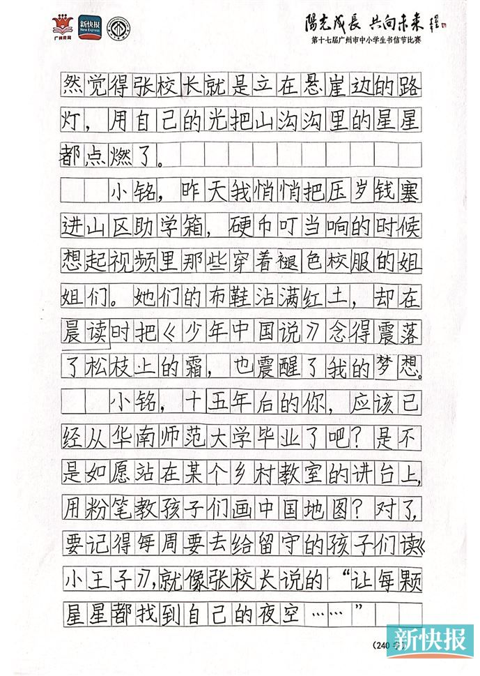 谈及为何选择给未来的自己写信,邓嘉铭的回答既童真又动人:“我想记住现在的心情和梦想,就像在心里种下一颗种子,希望它能在时光里慢慢长大。”自从了解到张桂梅校长的事迹,他便难以忘记这位“燃灯校长”用贴满膏药的手指一笔一画写板书的场景。一日走在珠江边,看着一盏盏路灯亮起,他萌生了成为一名乡村语文教师的想法。“我希望将来能像张校长一样,去乡村教书,让那里的孩子也能读到好书,看到更大的世界,就像一盏路灯,用自己的光把山里的星星都点亮。”对于儿子信中写下的梦想,母亲陈女士也表示全力支持:“我曾经在农村生活,深知教育对儿童的重要性。嘉铭选择的榜样非常好,我希望他能沿着这条路走下去,实现自己的梦想。”