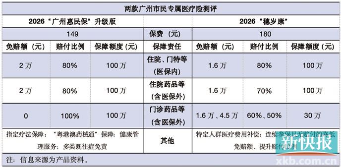 新快报记者对2026年度“广州惠民保”升级版和“穗岁康”进行测评。对于基本医保范围的住院、特定门诊医疗费用,两款产品的赔付比例、赔付上限均为80%、100万元,“穗岁康”的免赔额低于“广州惠民保”升级版,两者分别为1.6万元和2万元。从自费项目保障来看,“穗岁康”在住院医疗方面整体占优势,保额100万元,免赔额为1.6万元,赔付比例70%。“广州惠民保”免赔额和赔付比例分别为2万元和80%。“广州惠民保”的特药保障更为突出,免赔额为0,赔付比例达100%。
