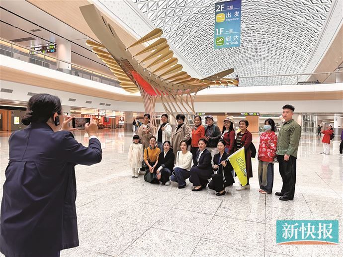 新快报讯 记者李佳文报道 在机场航站楼参加导览团是什么体验?上周五,白云机场正式推出全国首个集航站楼参观游览、公共艺术鉴赏于一体的机场文旅产品。本周二,天公不作美,但导览团依然有14名游客参与。他们用1.5小时边听讲解边打卡T3美景,还带走一张打卡照和一份文创产品。