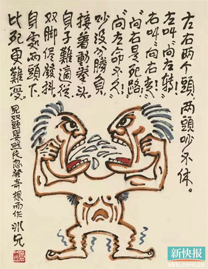 梁江:作为当代的著名漫画艺术家,冰兄有真正的“功夫在画外”。黄永玉曾经写过一份关于冰兄的文章,有一段话说:“绀弩老人曾经说过,廖冰兄是个大诗人。冰兄的竹枝词、粤讴,几乎是随口成章,句句见好,充满了机智和生活的欢快。一幅漫画,怎么容得下了冰兄的全部修养呢?但是冰兄一点也不自觉,仿佛他根本不是一个诗人似的,我觉得实在可惜”(见《中国建设》1981年第七期)。