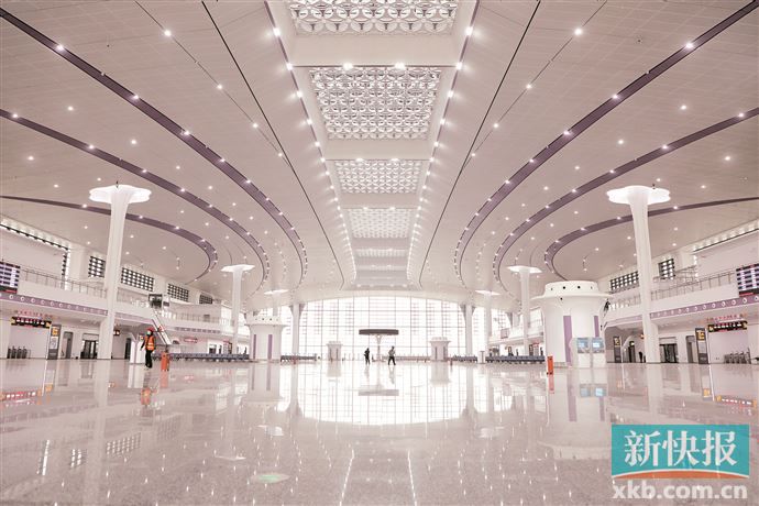 中国铁设广湛高铁湛江北站设计负责人张红云介绍,站房造型取自“紫荆湛放”,深度提炼湛江市花紫荆花的文化意象。站房屋面如绽放的花瓣般柔美舒展,紫荆花的藤紫色从进站厅、候车厅延伸至出站厅。换乘通廊内的文化展示墙展示粤剧、湛江傩舞、雷州石狗等民间艺术,让旅客能够直观感受到湛江的人文魅力。